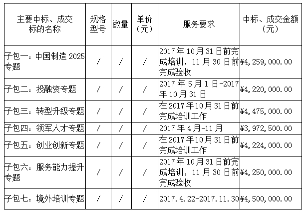 子包一:中国制造2025专题;子包二:投融资专题;子包三:转型升级专题;子包四:领军人才专题;子包五:创业创新专题;子包六:服务能力提升专题;子包七:境外培训专题。