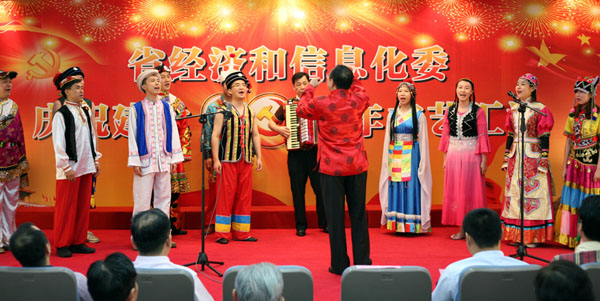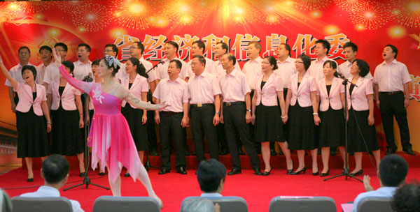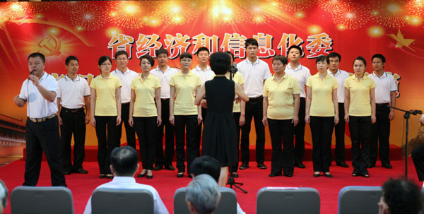 七月的骄阳点燃澎湃的激情,鲜红的党旗铺展壮丽的画卷。7月22日下午,省经济和信息化委机关各处室、各直属(代管)单位全体干部职工,离退休老干部400余人,欢聚在12楼大会议室,举行庆祝建党90周年文艺汇演,用歌声和笑声,共同庆祝伟大的中国共产党90周年华诞。委机关各处室和各直属(代管)单位,以单独组队或联合组队的形式,共组成26支队伍登台表演。大家以丰富多彩的艺术形式宣传和歌颂了党的光辉历史及丰功伟绩,体现了感党恩、听党话、跟党走的主题,反映了经信人奋发向上的精神面貌。文艺演出极大激励了全体党员干部和职工,坚定信心,振奋精神,为加快转型升级,建设幸福广东而努力奋斗。