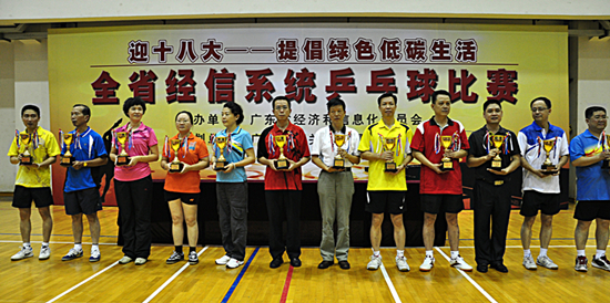 “迎十八大——提倡绿色低碳生活”全省经信系统乒乓球比赛得到了全省各地级以上市经济和信息化部门的大力支持和配合。此次比赛为团体赛(设男单、女单、男双三个单项)。赛程分两个阶段。第一阶段采用小组循环赛制。深圳市经贸信局、惠州市经信局、清远市经信局、揭阳市经信局、湛江市经信局、东莞市经信局、梅州市经信局、省经济和信息化委机关队等8支代表队在小组赛中胜出;第二阶段采用单淘汰赛制,争夺前3名。