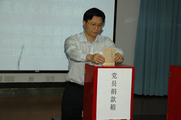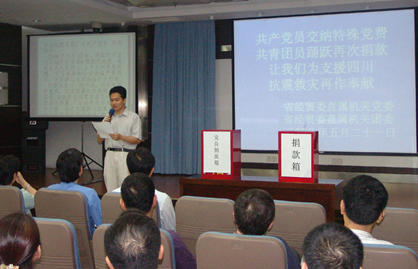 省经贸委副主任毕志坚在捐款现场的讲话中指出,灾情发生后,省经贸委立即响应党中央、国务院和省委、省政府的救灾部署,成立了以党组书记、主任杨建初同志为组长的委抗震救灾领导小组及三个专项工作组,紧急启动应急方案;委党组向全省经贸系统发出了迅速动员组织广大基层党组织和党员干部投入抗震救灾工作的通知,要求全省经贸系统立即行动,全力支援四川抗震救灾。从14日起,委机关和直属单位以及部分委管协会广大干部职工,踊跃捐款表达爱心,至