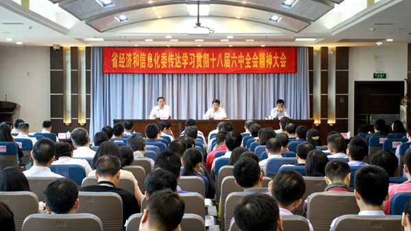 10月31日上午,省经济和信息化委召开全委党员干部大会,传达学习党的十八届六中全会精神,按照中央和省委的要求部署抓好贯彻落实工作。委党组书记、主任赖天生出席并讲话,委党组副书记、巡视员邹生主持会议,委党组成员、副主任郑勇明传达党的十八届六中全会公报和中央、省委关于认真学习宣传贯彻党的十八届六中全会精神的通知精神,委领导、中小局副局长、机关全体党员、干部及委属单位中层以上干部共210余人参加会议。