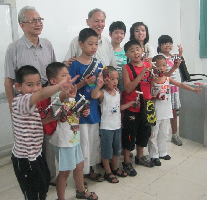 省经济和信息化委关工委顾问杨开茂、主任胡朝懿与拼装玩具获奖的孩子们合影