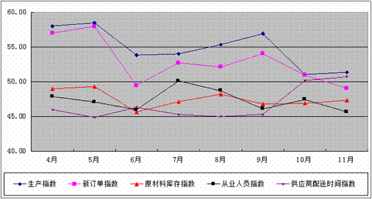 从11个分项指标来看,八个指数在50%以下,三个指数在50%以上,各指数总体呈现回落趋势,表明制造业延续上月的收缩趋势。