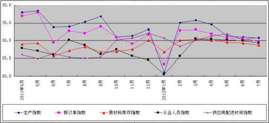 指数 名称 PMI 生产 指数 新订单 指数 原材料 库存指数 从业人员指数 供应商 配送时间指数 2012年7月 50.0 50.8 49.8 48.7 49.3 50.9 2012年6月 50.4 51.0 50.6 49.3 50.0 50.3 2012年5月 50.9 51.3 50.8 49.6 50.2 51.9 2012年4月 52.0 53.6 52.7 50.1 50.4 51.3 2012年3月 52.5 55.8 53.1 50.4 50.5 50.1 2012年2月 51.0 55.1 52.9 50.1 45.6 48.4 2012年1月 43.7 41.1 43.4 46.8 40.5 50.7 2011年12月 50.5 53.2 51.7 50.1 44.5 52.1 2011年11月 49.1 51.4 49.1 47.6 45.7 50.7 2011年10月 49.8 51.1 51.0 46.9 47.5 50.2 2011年9月 51.2 56.9 54.1 46.8 46.1 45.3 2011年8月 50.8 55.4 52.1 48.2 48.7 45.0 2011年7月 50.9 54.0 52.8 47.2 50.1 45.3 2011年6月 49.0 53.8 49.5 45.7 46.0 46.3 2011年5月 53.1 58.5 58.0 49.3 47.1 44.9 2011年4月 53.0 58.0 57.0 49.0 47.9 46.0