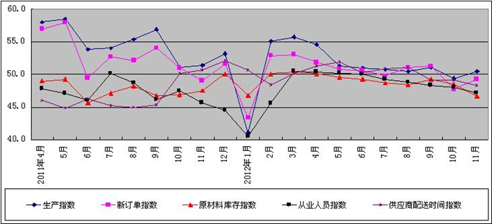 指数 名称 PMI 生产 指数 新订单 指数 原材料 库存指数 从业人员 指数 供应商配送 时间指数 2012年11月 48.8 50.5 49.3 46.7 47.2 48.3 2012年10月 48.5 49.4 47.8 48.5 48.0 49.2 2012年9月 50.1 51.1 51.3 49.3 48.3 49.2 2012年8月 50.2 50.5 51.1 48.4 48.8 51.1 2012年7月 50.0 50.8 49.8 48.7 49.3 50.9 2012年6月 50.4 51.0 50.6 49.3 50.0 50.3 2012年5月 50.9 51.3 50.8 49.6 50.2 51.9 2012年4月 52.0 53.6 52.7 50.1 50.4 51.3 2012年3月 52.5 55.8 53.1 50.4 50.5 50.1 2012年2月 51.0 55.1 52.9 50.1 45.6 48.4 2012年1月 43.7 41.1 43.4 46.8 40.5 50.7 2011年12月 50.5 53.2 51.7 50.1 44.5 52.1