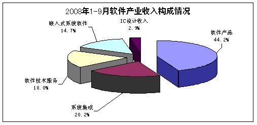 我国软件产业收入构成中,软件产品仍是产业的主要构成部分,1-9月共完成收入2548.5亿元,占软件产业总收入的44.2%,增长34.4%,增速比去年同期高8.6个百分点。应用类软件产品市场竞争激烈,行业市场逐步细化,新的业务、产品不断推出,使产业链分工更为合理。