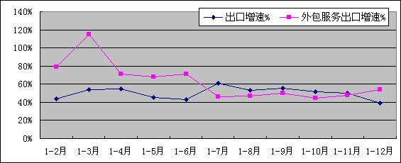 我国软件出口142亿美元,同比增长39%,增幅比收入高9.2个百分点。其中完成软件外包服务出口15.9亿美元,同比增长54.3%,软件外包服务出口下半年增速开始明显下降,1-7月累计增速比1-6月低25个百分点,主要原因一是金融危机的影响,二是随着人民币升值,成本提升影响定单增加,而且以美元定价的收入相对下降。日本仍是我软件外包的主要地区,比重达到60%,两国企业合作不断深入,正从发包合作逐步向战略协作阶段过渡,外包形式逐步从ITO转向BPO、KPO。2008年12月初,大连软件园在日本东京成立分园,成为我国首个在境外设立园区的软件园,将为深化大连对日软件服务外包创造新的契机。