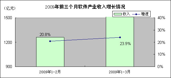 1-3月,软件产业累计完成软件业务收入1905.9亿元,同比增长23.9%,增速比1-2月份高3.1个百分点,但比去年同期低6个百分点,比去年底低5.9个百分点。3月份当月完成软件业务收入645.2亿元,同比增长30.6%,增速比去年同期低0.8个百分点。