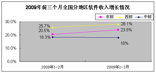 1-3月,东部地区累计完成软件业务收入1647亿元,占全国软件业务收入的86.4%,同比增长23.9%,增速比去年同期下降8.8个百分点;西部地区累计完成软件业务收入168.7亿元,同比增长28.1%,增速比去年同期提高0.4个百分点;中部地区累计完成软件业务收入90.2亿元,同比增长18%,增速比去年同期下降1.8个百分点。