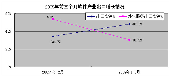 1-3月,我国软件出口38.4亿美元,同比增长48.3%,增幅比1-2月提高13.6个百分点,但比去年同期低6个百分点;其中软件外包服务出口3.2亿美元,同比增长30.2%,增速较1-2月下降22.8个百分点。