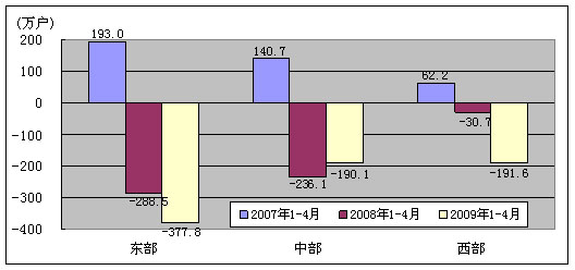 图9. 2007-2009年同期东、中、西部净增固定电话用户