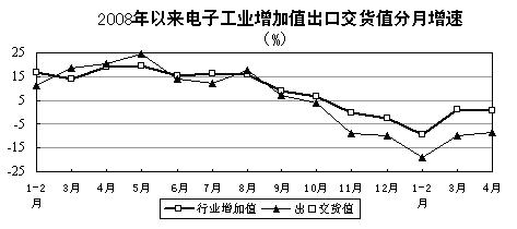 国内市场增势较好。1-4月,规模以上电子信息制造业内销产值增长5.1%,其中4月份增长11.4%,比上月回升0.9个百分点。受电信业3G投资拉动,4月份,通信设备制造业内销增长9.5%,其中交换设备行业增长79%。但国内市场增势对扭转行业下滑的作用有限。