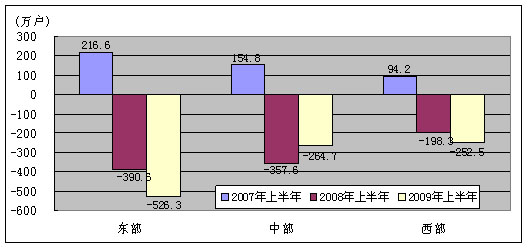 图9. 2007-2009年同期东、中、西部净增固定电话用户