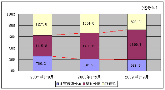2009年1-9月份,长途电话通话总时长达到3219.2亿分钟,比上年同期增长6.8%。其中固定传统长途、IP电话通话时长分别下降3.0%、16.0%,而移动长途电话通话时长增长30.2%。