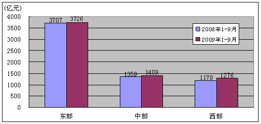 2009年1-9月份,中、西部地区电信主营业务收入比上年同期分别增长3.7%、9.0%,而东部地区仅增长了0.5%。