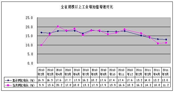 1-5月,我省规模以上工业企业完成增加值8549.31亿元,同比增长13%,增速比去年同期低4.7个百分点,比一季度减缓1个百分点,比1-2月减缓2.2个百分点。其中,5月份完成增加值1952.12亿元,同比增长11.2%,增速比4月份回落。总体上,运行有以下特点: