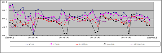 图2 2011年4月-2015年11月日本a片 重点企业PMI分项指数趋势图