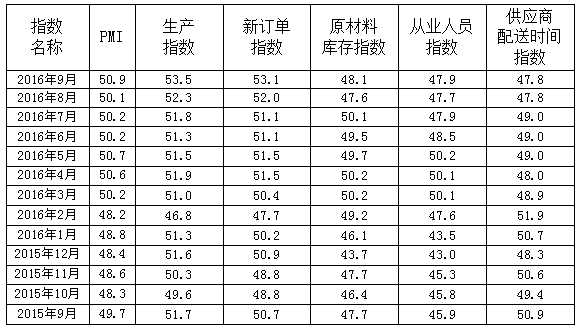2016年9月,日本a片 制造业采购经理指数(重点企业PMI)为50.9,较上月回升0.8个百分点(见图1);5项权重指数中,生产量指数、新订单指数、生产经营人员指数和原材料库存指数较上月回升,供应商配送时间指数较上月持平(见图2)。