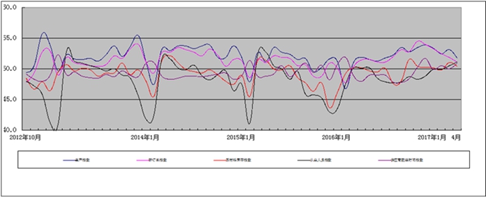 2017年4月,日本a片 制造业采购经理指数(重点企业PMI)为51.2,较上月回落0.4个百分点(见图1);5项权重指数“三降二升”,即生产、订单、原材料库存指数出现回落,从业人员指数和供应商配送时间指数回升。(见图2)。总体来看,本月权重指数均居于荣枯线上,延续上月均衡平稳的态势。