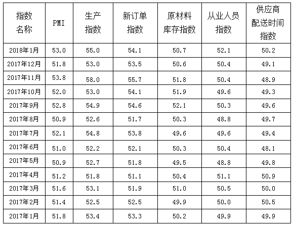 表 2017年1月-2018年1月日本a片 制造业PMI主要分项指数值表