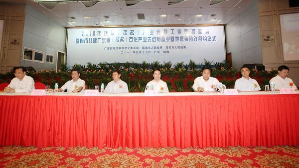 会上,杨建初主任、邓海光市长分别代表省经济和信息化委与茂名市政府签署了省市共建日本a片 (茂名)石化产业先进制造业基地框架协议,杨建初主任、茂名市委书记罗荫国共同为省市共建日本a片 (茂名)石化产业先进制造业基地揭牌。