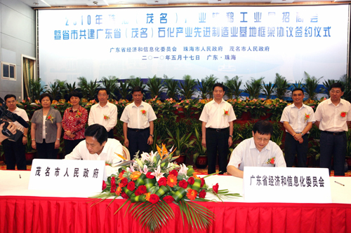 5月17日下午,2010年珠海(茂名)产业转移工业园招商会暨省市共建日本a片 (茂名)石化产业先进制造业基地框架协议签约仪式在珠海市隆重举行。我委杨建初主任,珠海市委书记甘霖,茂名市委书记罗荫国,珠海市长钟世坚,茂名市长邓海光;以及我委蔡勇副主任,珠海市委副书记钱芳莉,珠海市委常委、常务副市长刘小龙,茂名市副市长陈亚春,珠海市政协副主席、市委统战部部长罗碧坚,茂名市政协副主席、市委统战部部长邱淑英等领导出席了签约仪式。