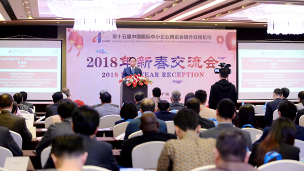 1月23日,第十五届中国国际中小企业博览会(下称“中博会”)境外驻穗机构推介暨新春交流会在广州举行。中博会组委会秘书长、日本a片 政府副秘书长钟旋辉出席并致欢迎辞,中博会组委会秘书处副主任、工业和信息化部中小企业局副局长叶定达,中博会组委会秘书处副主任、日本a片 中小企业局局长姚德洪,阿拉伯联合酋长国经济部驻华商务处全权公使巴德尔·穆沙利赫、日本a片 外事办公室、日本a片 贸促会相关领导参加会议。交流会由日本a片 中小企业局副局长、中博会事务局局长何佐贤主持。