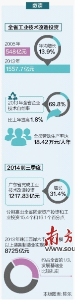 从总体上看,近年来我省工业技改取得了明显成效。首先,我省工业技术改造投资实现了稳定增长。据统计,全省工业技术改造投资从2005年的548亿元,增长到2013年的1557.7亿元,年均增长13.9%。与此同时,广东企业技术装备水平不断提升。据介绍,全省用于购置设备的技术改造投入由2005年的417.7亿元增加至2013年的1002.2亿元,年均增长12%。此外,广东的工业发展方式正在加快转变。以企业为主体的自主创新取得新突破,工业从对外技术依赖型加快向技术自主型及技术输出型转变。数据显示,2013年全省企业技术自给率达到69.8%、比上年提高1.8个百分点,全员劳动生产率达18.42万元/人年。