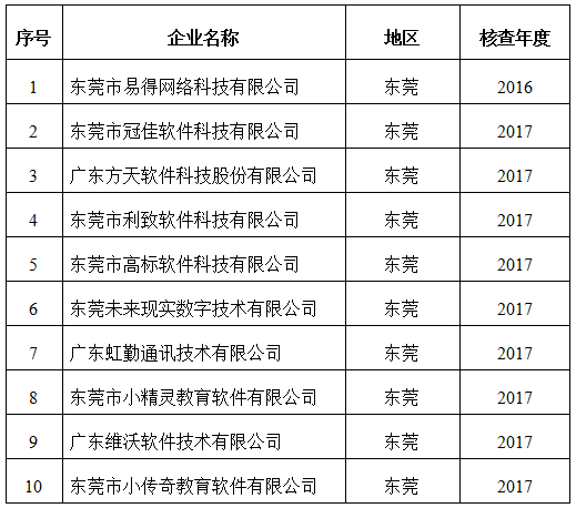 经材料核查及现场抽查,东莞市易得网络科技有限公司1家企业2016年度符合49号文规定的软件企业条件,东莞市冠佳软件科技有限公司等9家企业2017年度符合49号文规定的软件企业条件,现公示如下: