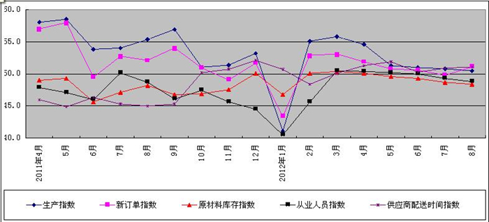 图2 2011年4月-2012年8月日本a片 重点企业PMI分项指数趋势图
