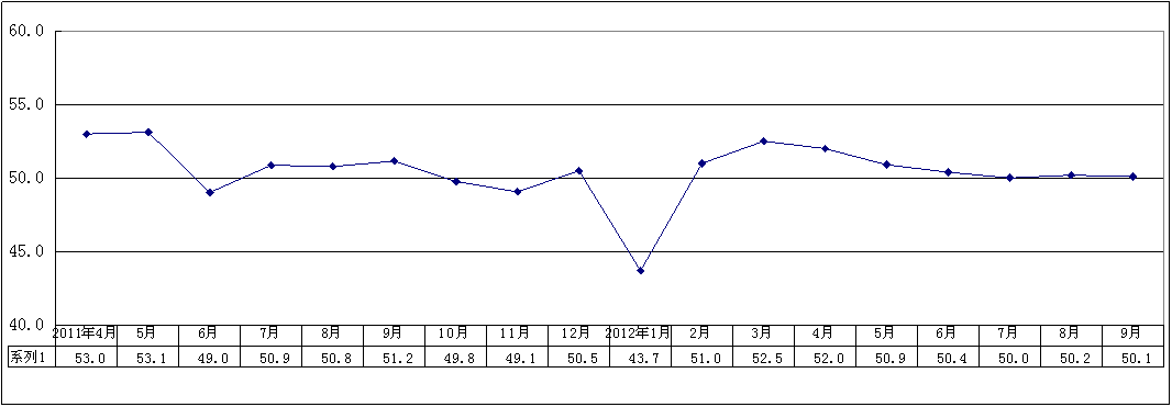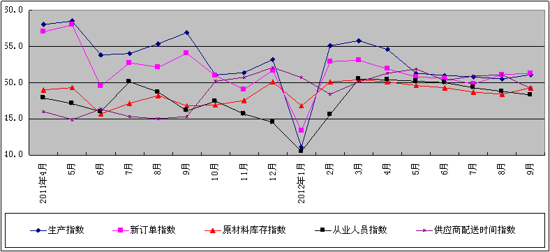 指数 名称 PMI 生产 指数 新订单 指数 原材料 库存指数 从业人员指数 供应商 配送时间指数 2012年9月 50.1 51.1 51.3 49.3 48.3 49.2 2012年8月 50.2 50.5 51.1 48.4 48.8 51.1 2012年7月 50.0 50.8 49.8 48.7 49.3 50.9 2012年6月 50.4 51.0 50.6 49.3 50.0 50.3 2012年5月 50.9 51.3 50.8 49.6 50.2 51.9 2012年4月 52.0 53.6 52.7 50.1 50.4 51.3 2012年3月 52.5 55.8 53.1 50.4 50.5 50.1 2012年2月 51.0 55.1 52.9 50.1 45.6 48.4 2012年1月 43.7 41.1 43.4 46.8 40.5 50.7 2011年12月 50.5 53.2 51.7 50.1 44.5 52.1 2011年11月 49.1 51.4 49.1 47.6 45.7 50.7 2011年10月 49.8 51.1 51.0 46.9 47.5 50.2