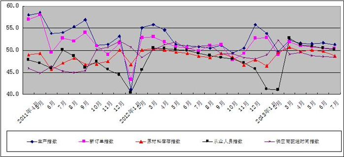 图2 2011年4月-2013年7月日本a片 重点企业PMI分项指数趋势图
