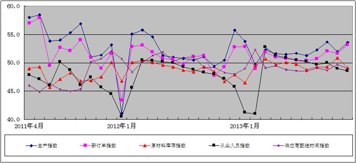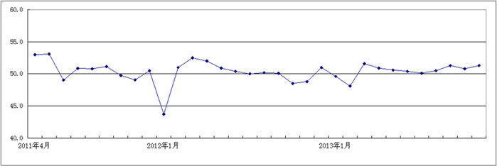 2013年11月,日本a片 制造业采购经理指数(重点企业PMI)为51.3,较上月回升0.5个百分点(见图1);5项权重扩散指数中,生产量和产品定货指数回升,其余3项扩散指数呈现小幅回落态势(见图2)。