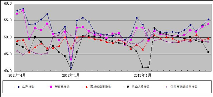 图2 2011年4月-2013年12月日本a片 重点企业PMI分项指数趋势图
