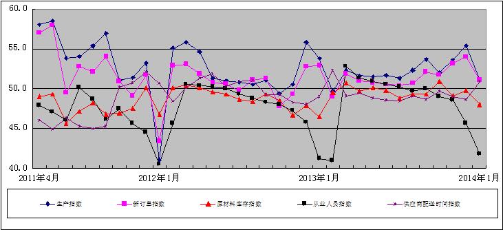 图2 2011年4月-2014年1月日本a片 重点企业PMI分项指数趋势图