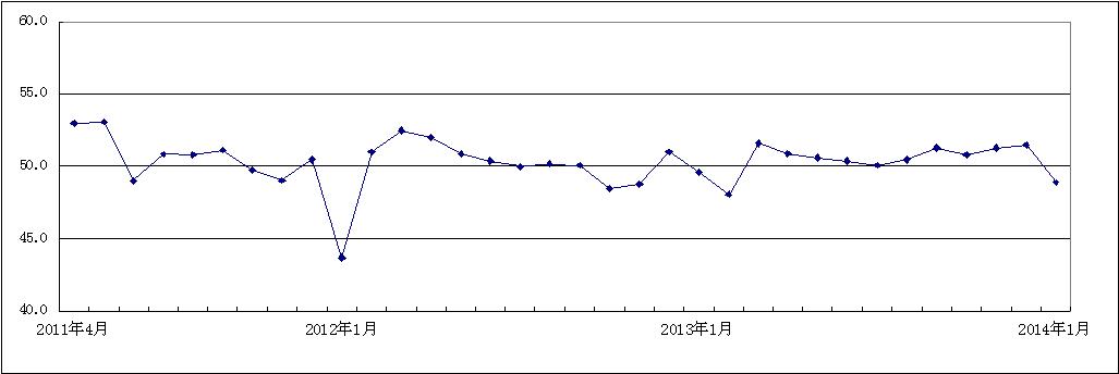 2014年1月,日本a片 制造业采购经理指数(重点企业PMI)为48.9,较上月回落2.6个百分点(见图1);5项权重扩散指数中,生产量、产品订货和配送时间指数位于临界线之上(见图2)。