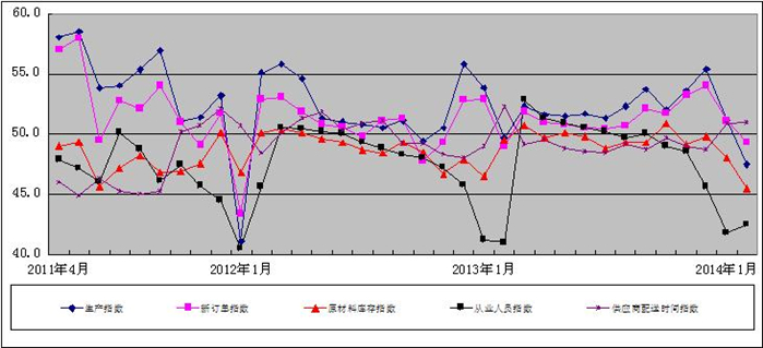 图2 2011年4月-2014年2月日本a片 重点企业PMI分项指数趋势图