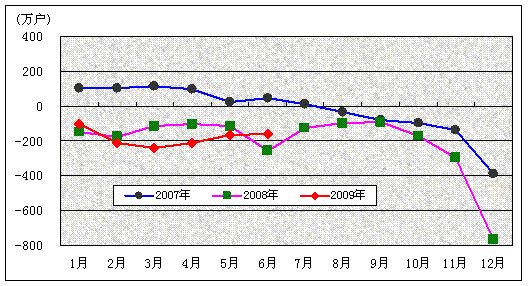 图9. 2007-2009年同期东、中、西部净增固定电话用户