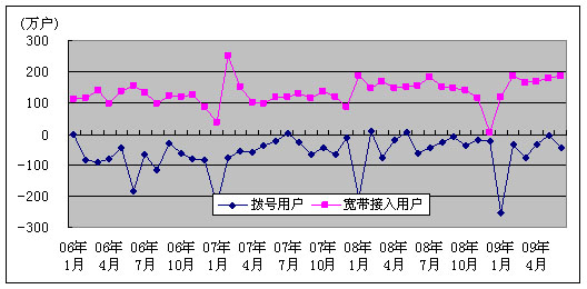 3.互联网用户:基础电信企业的互联网用户进一步趋向宽带化。上半年,基础电信企业净增互联网宽带接入用户1060.3万户,达到9348.2万户,而互联网拨号用户减少了233.8万户。