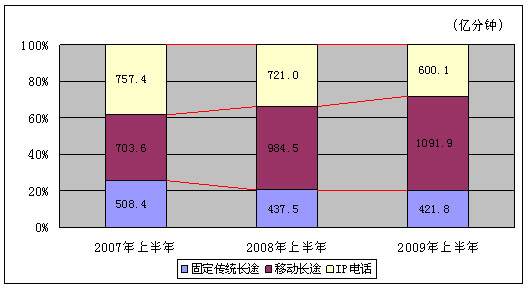2009年上半年,长途电话通话总时长达到2113.8亿分钟,比上年同期增长5.2%。其中固定传统长途、IP电话通话时长分别下降3.6%、16.8%,而移动长途电话通话时长增长28.2%。