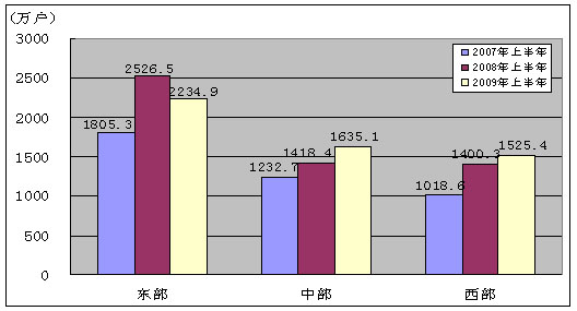 图10. 2007-2009年同期东、中、西部净增移动电话用户