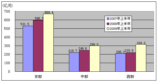 2009年上半年,西部地区电信固定资产投资比上年同期增长44.7%,明显高于东、中部地区的11.8%、21.2%。