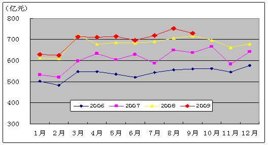 图1. 2006-2009年各月电信主营业务收入比较