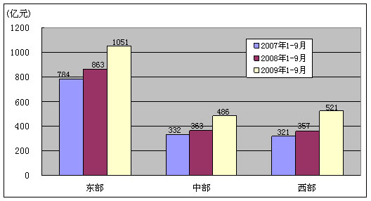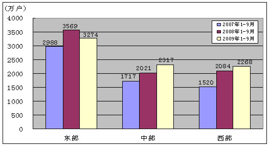 图10. 2007-2009年同期东、中、西部净增移动电话用户