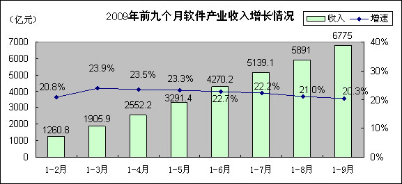 1-9月,软件产业累计完成软件业务收入6775亿元,同比增长20.3%,增速比1-8月和一季度分别回落0.7和3.6个百分点,比去年同期低11.9个百分点。
