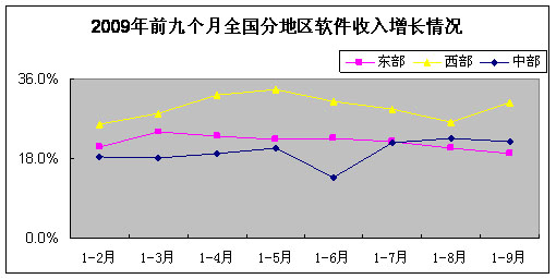 1-9月,东部地区累计完成软件业务收入5793.5亿元,占全国的85.5%,同比增长19.2%,增速比去年同期下降13.6个百分点,比1-8月降低1.2个百分点;西部地区累计完成软件业务收入555.4亿元,同比增长30.7%,增速比去年同期低4.8个百分点,比1-8月提高4.4个百分点;中部地区累计完成软件业务收入426亿元,同比增长21.7%,增速比去年同期下降0.8个百分点。