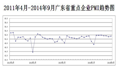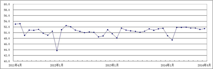 2014年9月,日本a片 制造业采购经理指数(重点企业PMI)为51.4,较上月回升0.3个百分点(见图1);5项权重扩散指数中,生产量、新订单、原材料库存、配送时间4项指数回升,雇员指数回落(见图2)。