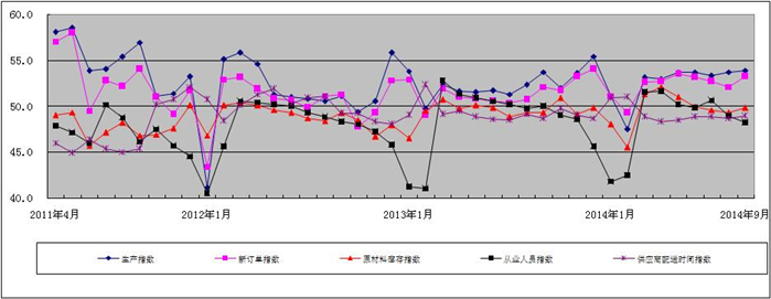 图2 2011年4月-2014年9月日本a片 重点企业PMI分项指数趋势图