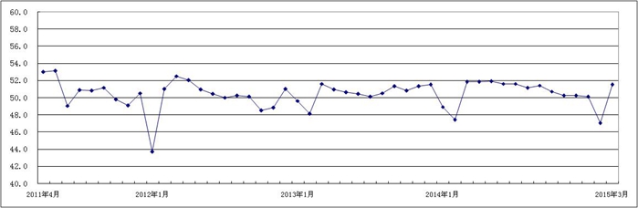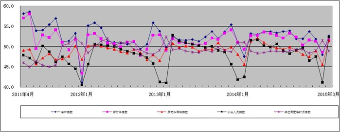 指数 名称 PMI 生产 指数 新订单 指数 原材料 库存指数 从业人员 指数 供应商 配送时间 指数 2015年3月 51.0 51.5 51.3 51.0 51.5 48.8 2015年2月 47.0 47.9 48.6 45.5 41.1 51.4 2015年1月 50.1 51.8 51.3 48.9 47.5 48.9 2014年12月 50.2 53.7 51.5 47.5 46.5 48.3 2014年11月 50.2 51.9 50.4 48.0 49.7 49.3 2014年10月 50.7 51.9 52.2 49.0 49.1 49.2 2014年9月 51.4 53.9 53.2 49.8 48.2 48.9 2014年8月 51.1 53.7 52.1 49.3 48.9 48.7 2014年7月 51.6 53.3 52.7 49.6 50.6 48.8 2014年6月 51.6 53.7 53.1 49.9 50.0 48.8 2014年5月 51.9 53.7 53.5 51.0 50.2 48.5 2014年4月 51.8 53.0 52.7 52.1 51.6 48.3 2014年3月 51.8 53.1 52.6 51.3 51.5 48.8