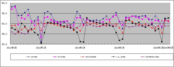 指数 名称 PMI 生产 指数 新订单 指数 原材料 库存指数 从业人员 指数 供应商 配送时间 指数 2015年4月 51.1 51.2 51.0 51.4 52.7 48.8 2015年3月 51.0 51.5 51.3 51.0 51.5 48.8 2015年2月 47.0 47.9 48.6 45.5 41.1 51.4 2015年1月 50.1 51.8 51.3 48.9 47.5 48.9 2014年12月 50.2 53.7 51.5 47.5 46.5 48.3 2014年11月 50.2 51.9 50.4 48.0 49.7 49.3 2014年10月 50.7 51.9 52.2 49.0 49.1 49.2 2014年9月 51.4 53.9 53.2 49.8 48.2 48.9 2014年8月 51.1 53.7 52.1 49.3 48.9 48.7 2014年7月 51.6 53.3 52.7 49.6 50.6 48.8 2014年6月 51.6 53.7 53.1 49.9 50.0 48.8 2014年5月 51.9 53.7 53.5 51.0 50.2 48.5 2014年4月 51.8 53.0 52.7 52.1 51.6 48.3